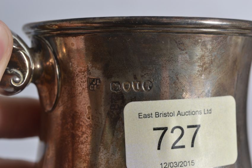 A silver hallmarked tankard with leaf design to handle, tapered base with hallmarks clearly to rim. 375.5g
