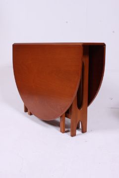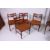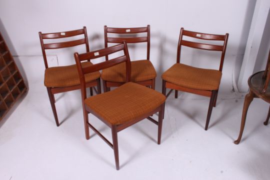 A retro 1970's G-Plan style teak drop leaf dining table raised on pierced supports together with a set of 1950's retro teak propeller back dining chairs having tapered supports with original upholstery