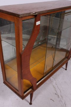 A fabulous retro teak 1960's display cabinet having tapered supports with glass details and shaped facia with shelves set within. Measures: 94cms x 104cms x 31cms.