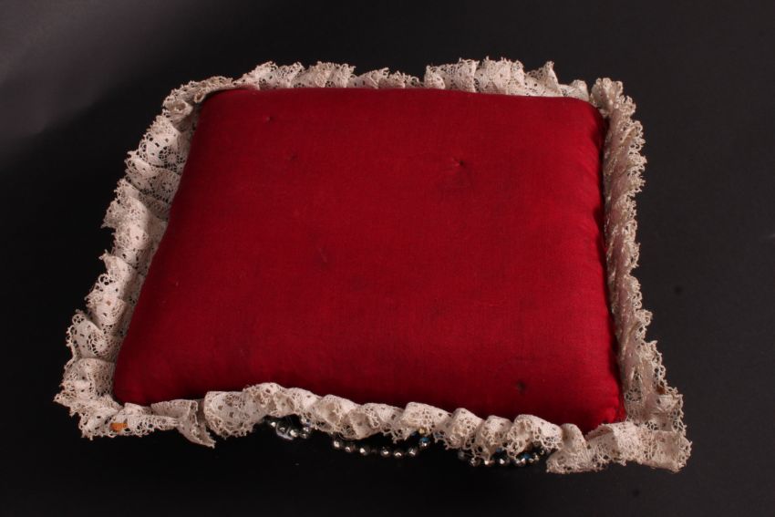 A 19th / early 20th century American Iroquois pin cushion, possibly Portland, Ohio. The commemorative cushion heavily adorned with glass pins bearing notation to the sides ' Wishing you good luck, a present from Portland ' Measures: 23cms H x 27cms W.