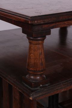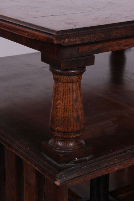 A large 19th century Victorian Arts & Crafts oversized revolving library bookcase raised on a quadruped base having ceramic castors. The square upright body with sectioned sides having slatted facia.