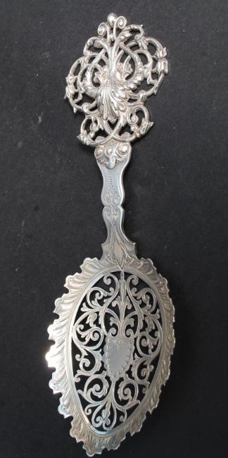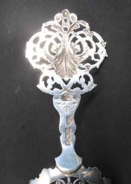 A hallmarked silver large cast and pierced spoon of decorative form bearing London hallmarks for Goldsmiths and Silversmiths Company 1902. Weight 55g