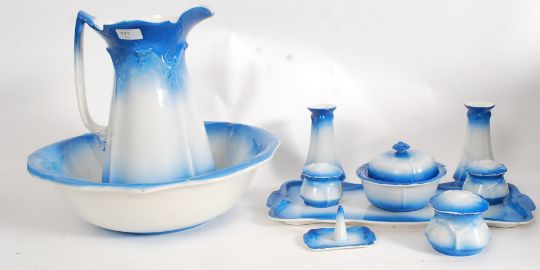 An early 20th century Staffordshire wash basin and jug, along with matching dressing table set in blush blue colouring.