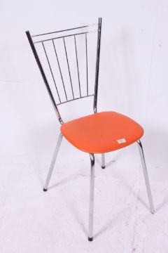 A Harry Bertoia wire work chrome chair with orange vinyl seat together with a pair of Industrial steps