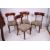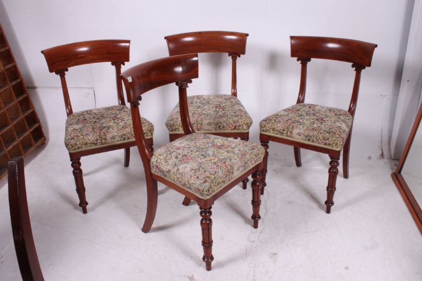 A set of 4 William IV early 19th century bar back dining chairs. Raised on tapered supports with overstuffed tapestry upholstered seats having bar shaped back rests to the rear. Measures: 85cms x 48cms x 45cms.