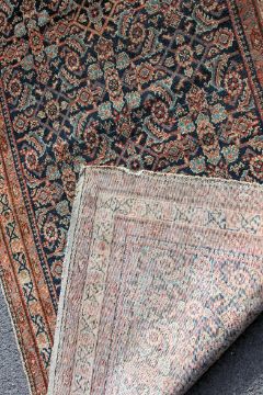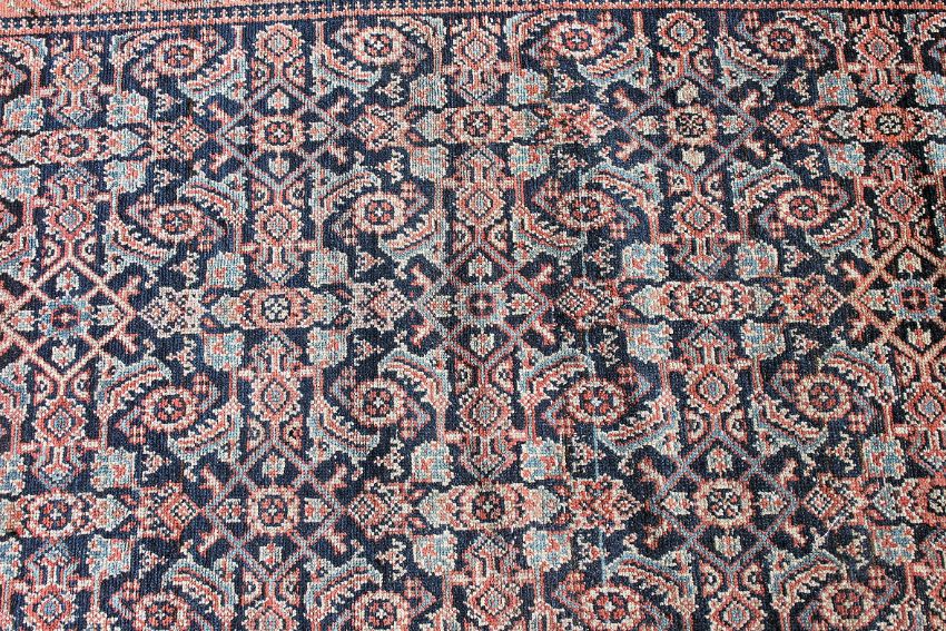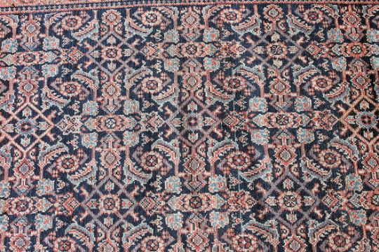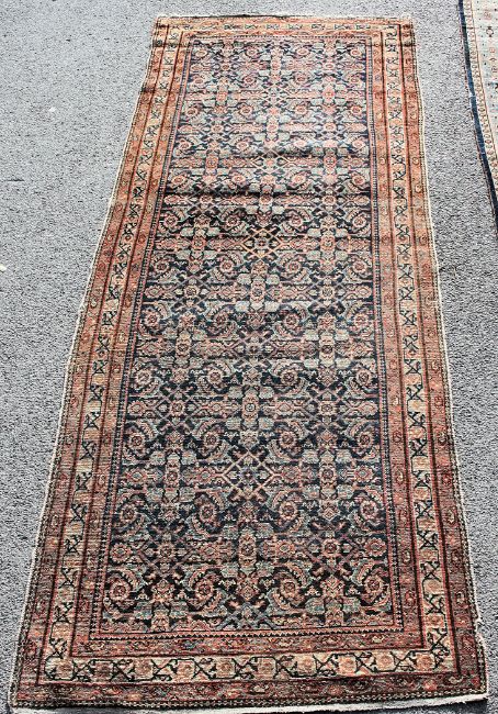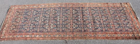An early 20th century large handwoven Persian rug having central blue ground with Hyacinth - regenerative design having running water symbols to the borders. Measures 290cms x 106cms