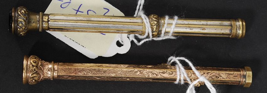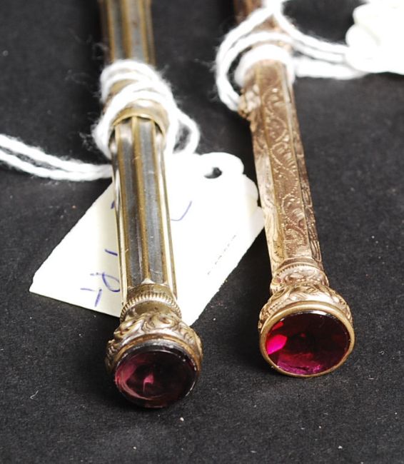 A gold plated 19th century twin propelling pencil being chase rococo having inset red stone. Together with a silver plated propelling pencil with amethyst stone top