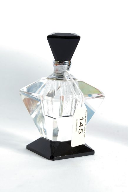 A cut glass Art Deco style ladies perfume bottle complete with the lid and dabber. Measures: 10.5cms.
