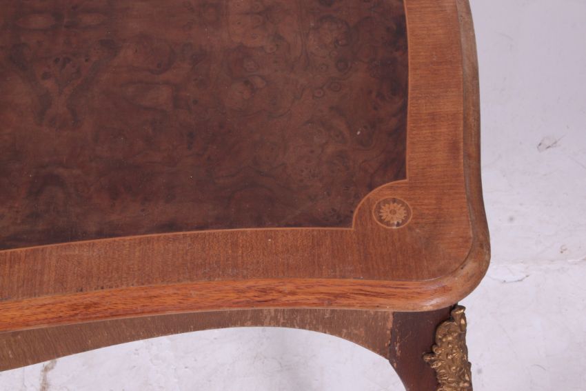 A 20th century antique style marquetry inlaid coffee table raised on shaped supports with ormulu mounts to the walnut and oak. Measures: 50cms x 115cms x 55cms.