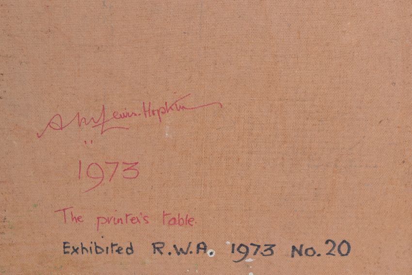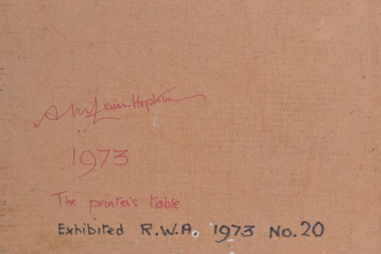 Audrey Lewis Hopkins ( 1914 - 2011) An oil on hardboard painting study entitled ' The printer's table ' Signed on reverse with notation being Exhibited at R.W.A. 1973 no.20. Measures 61 x 71 cms Cost to post UK on a tracked and recorded service £15.99 + VAT Cost to Post Ireland, France & Germany £35.00 = VAT Other locations, please enquire