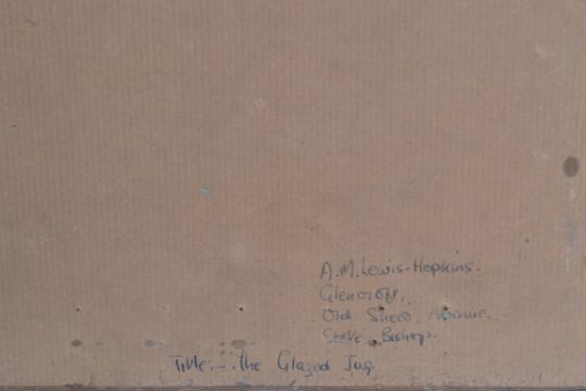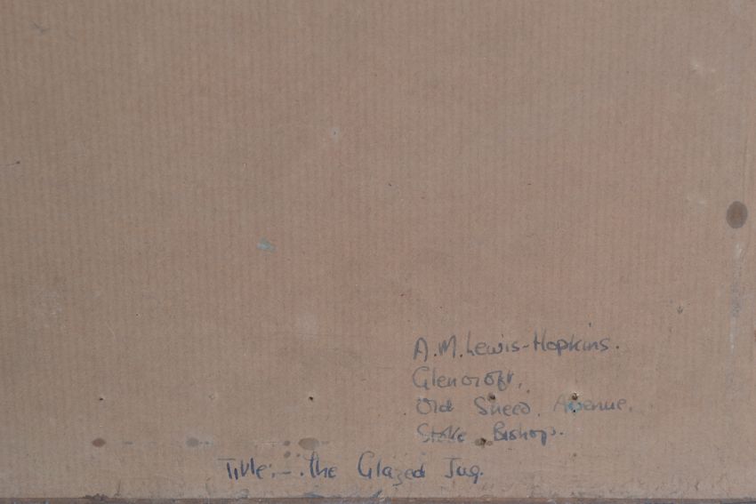 Audrey Lewis Hopkins ( 1914 - 2011) A watercolour painting still life study entitled ' The Glazed Jug ' Signed to lower corner with inscription to verso. Cost to post UK on a tracked and recorded service £15.99 + VAT Cost to Post Ireland, France & Germany £35.00 = VAT Other locations, please enquire