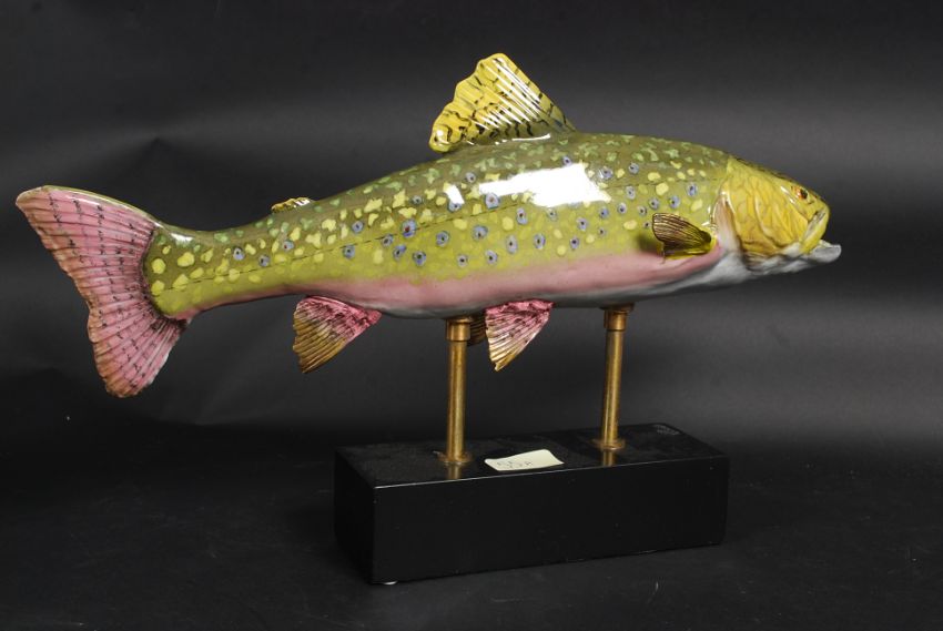 A large ceramic rainbow trout on a stand