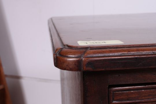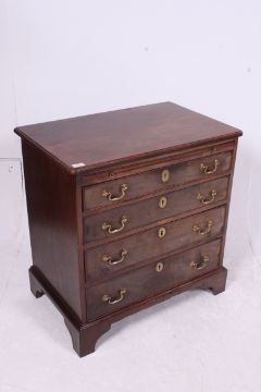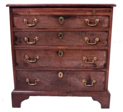 An 18th century Georgian mahogany bachelors chest of drawers. The chest standing on bracket legs supporting a well proportioned chest having a set of 4 straight drawers with brushing slide above. Fabulous brass swan handles and oval brass key escutcheons having axe head finial handles to the brushing slide. The drawers being oak lined drawers having front to back planking with thin drawer linings of good quality being dovetailed. Atop a flared edge chest top with good chamfered and reeded detailing to the front corners, original back panels in place.