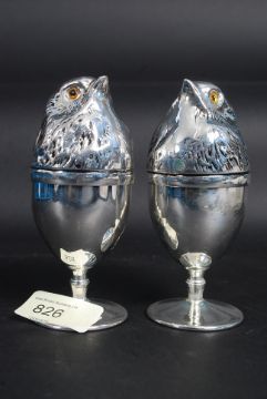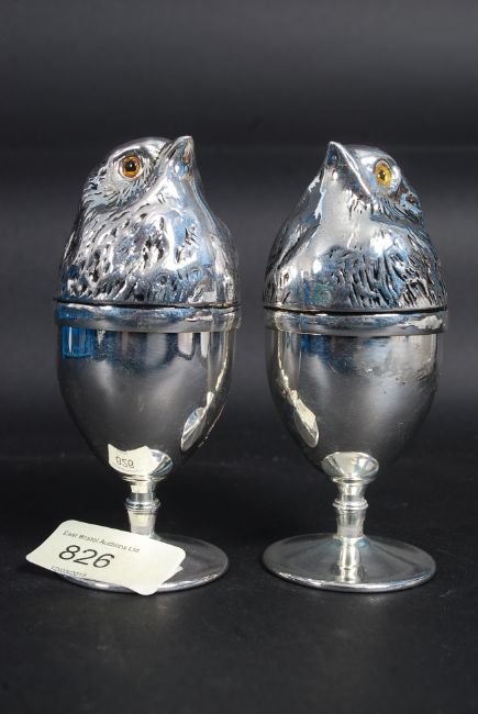 A pair of silver plated egg cups in the form of birds