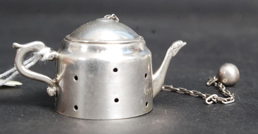 An American silver tea infuser in the form of a teapot complete with chain. The handle marked for 800 with indistinct mark. 19.1g