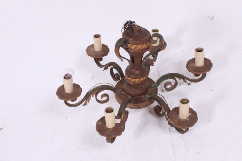 A decorative early 20th century toleware wooden 6 branch chandelier, likely French.