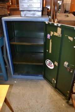 A vintage industrial metal painted safer / locker maintaining original key and heavy handle