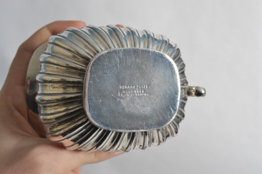 A good quality silver plate tea service comprising teapot, creamer and sugar bowl stamped for Kemp Bros of Bristol. Together with an un-associated silver plate salver tray