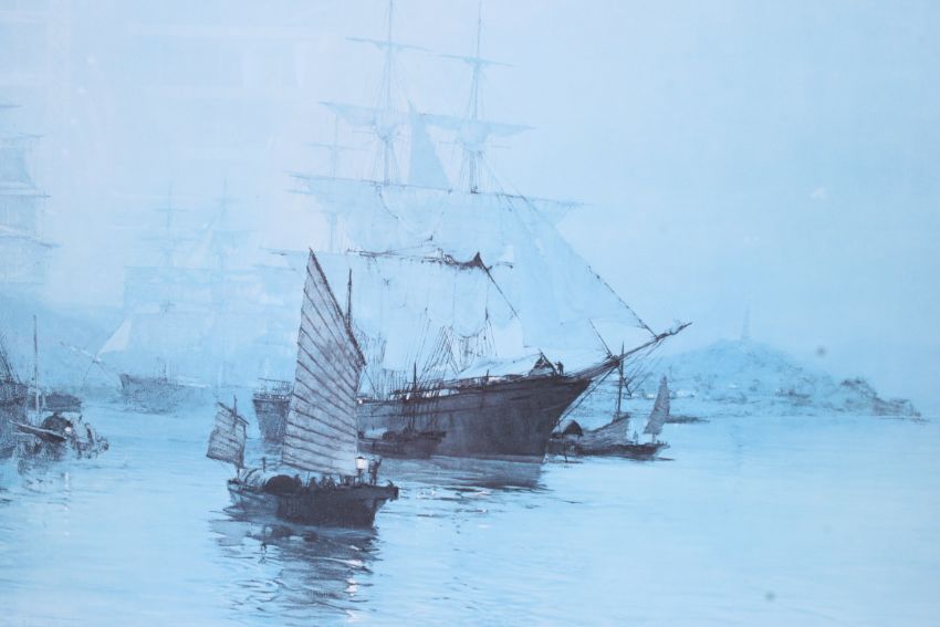 After Montague Dawson. Entitled ' Pagoda Anchorage ' A large maritime scene being framed and glazed with notation to the margins.