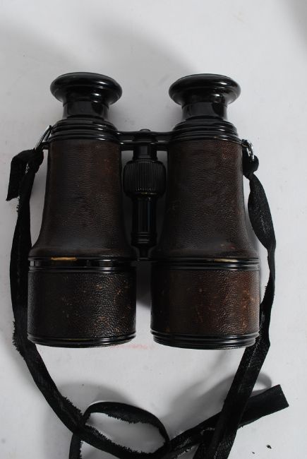 A pair of early 20th century WW1 French binoculars, stamped Lemaire Fabi, Paris. The leather case bearing military crows foot markings