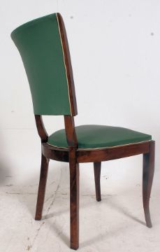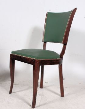A set of 6 1930's French Oak two tone dining chairs. Raised on tapered supports having fabulous green vinyl and white piped seats and back rests