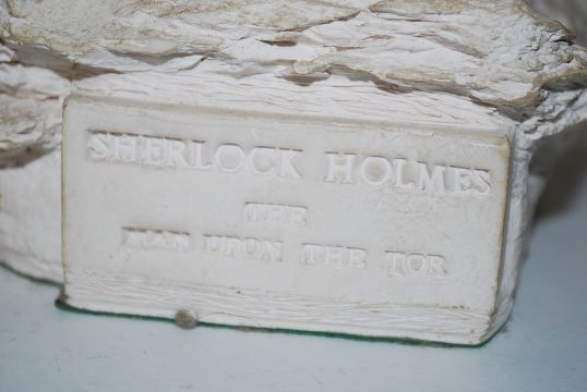 A Resin cast figurine of Sherlock Holmes raised upon plinth with notation ' Sherlock Holmes ' The Man Upon The Tor' Created by Michael Coote, Illustrator for the Sherlock Holmes Society
