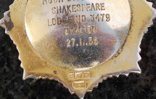 A gilded silver hallmarked and enamel masonic lodge badge with notation to verso for Brother Hugh B. Gebrych, Shakespeare Lodge No 3479 Exalted 27.11.56. Hallmarks for Birmingham. Gross weight 31.7g