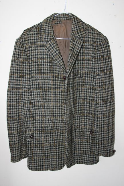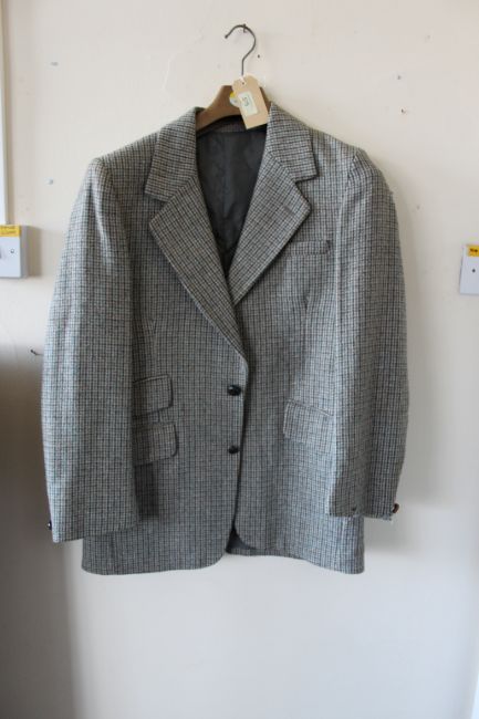 2 retro vintage circa mid 20th century tweed gentlemans suit jackets having lined interiors, one being marked for Austin Reed