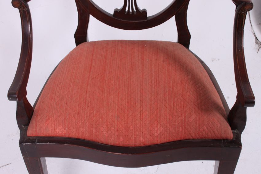 An Edwardian mahogany inlaid salon carver armchair. Raised on square tapered legs with spade feet having upholstered drop in seat with wheatsheaf pierced backrest having inlaid centre. Measures: 108cms x 48cms x 48cms.