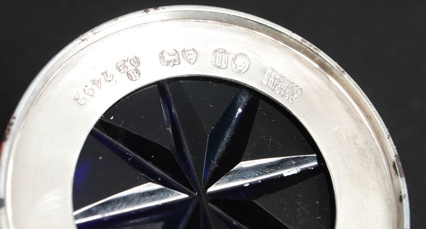 A Victorian silver hallmarked pierced mustard pot by Richards & Brown -Edward Charles Brown. Hallmarked for London 1868. The pot with blue glass liner having chase decorated hinged lid. Weight 92.6g exc lining