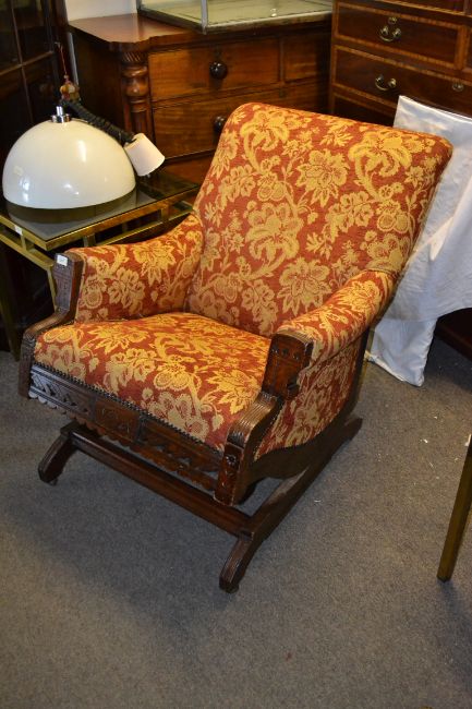 A Victorian 19th century aesthetic movement mahogany large rocking chair / armchair of Chesterfield style. The base with swing mechanism having large armchair upholstered in good chenille fabric atop