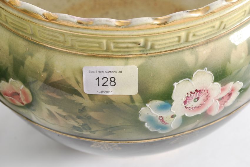 A Wedgwood Jasperware planter having classical scenes in Cobalt blue finish stamped Wedgwood England to base along with a Victorian Staffordshire planter of similar size. Measures: 23cms.