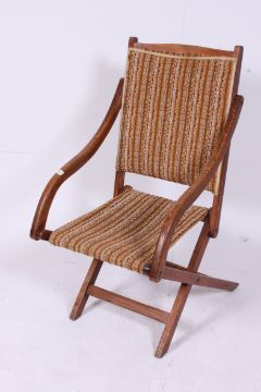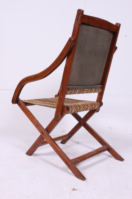 A Victorian oak folding campaign style deck chair with curved supports. Measures: 103cms x 52cms x 77cms.