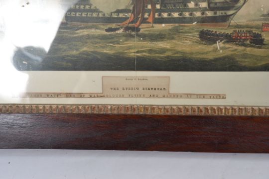 A 19th century lithograph print entitled Queens Parade. The James Watt - Man of War tall ship by George Leighton. Framed and glazed. Measures: 31cms x 48cms.