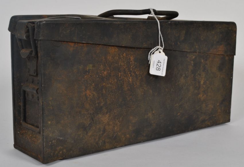 A 1940's WW2 German Nazi stamped ammunition box bearing markings for BRH/40 which is the date 1940 and the manufacturer Schaltbau, Munich together with the Nazi and eagle emblem. Measures 17cms high x 37cms length x 9cms depth
