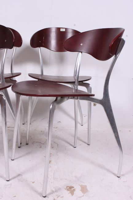 A set of 4 20th century contemporary retro style chrome and panelled wood cafe chairs. The atomic / sputnik style chrome frames supporting panelled wooden seats and back rests. Measures: 82cms x 45cms x 50cms.
