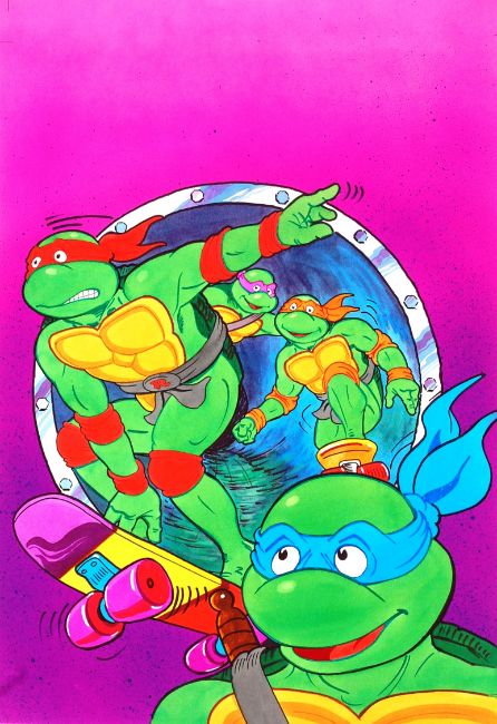 ORIGINAL TEENAGE MUTANT HERO TURTLES ARTWORK; An original piece of artwork produced by CLIC (The Character Licensing Illustration Company) in the 1990's for Mirage / Grandreams productions - the company responsible for all Teenage Mutant Hero / Ninja Turtles annuals, colouring books and other literature. Each piece is offered in original condition, most within the original artists folios. Some with printers annotation to margins in pencil, others with tracing paper overlaid with notes. All are pen, ink and pastel pictures and all are bright. Some have publishing details to front, but many can be traced to the 1990 Annual, 1991 Annual, 1992 Annual, 1990 Colouring & Cutout book and various art / colouring books of the period. Including several full front cover used pictures. A unique collection. This piece of large artwork depicting the Turtles (one skateboarding ) through the sewers on a purple background. 43x30cm