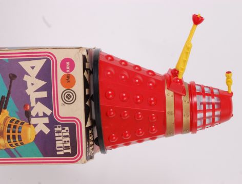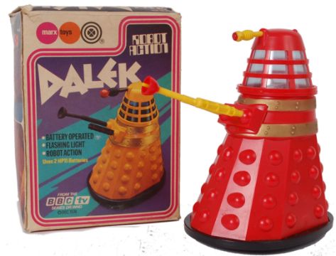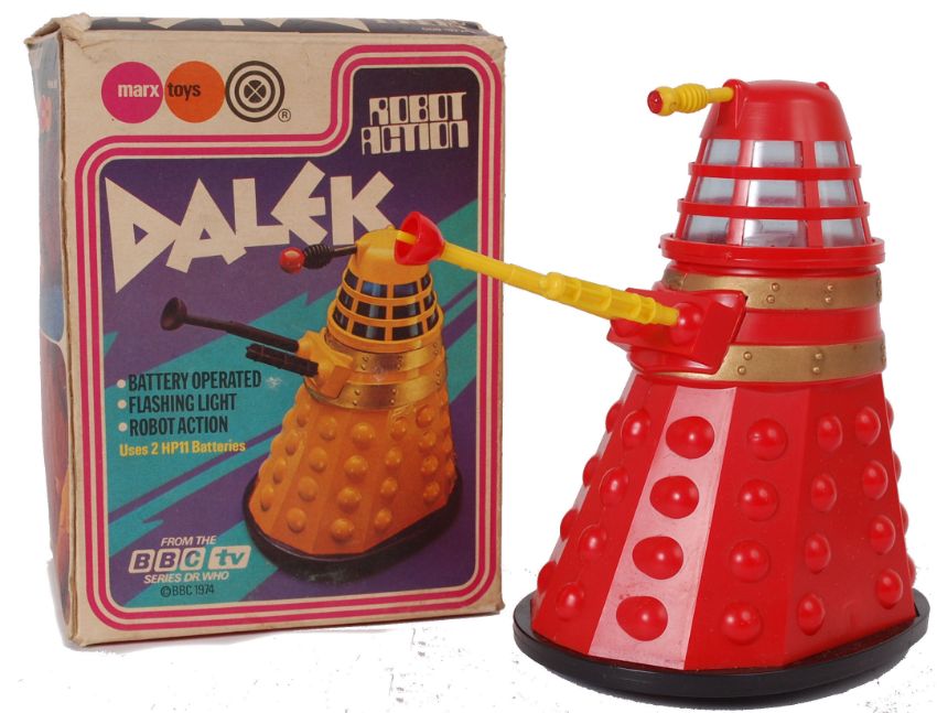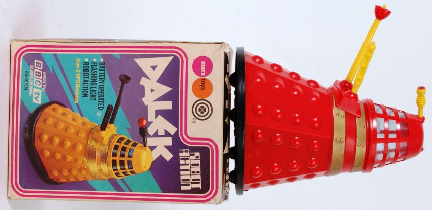 DOCTOR WHO DALEK; An original and rare 1974 Marx Toys battery operated Doctor Who Dalek toy, in red plastic with gold banding. Complete with detachable arms (x3) in yellow. In original box. ' Battery Operated, Flashing Light, Robot Action '.