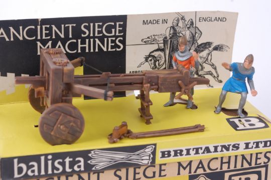 BRITAINS; A rare and vintage Britains Ancient Siege Machines ' Balista ' boxed set, complete with figures and firing spears. Within original box, still retaining original cardboard display liner.
