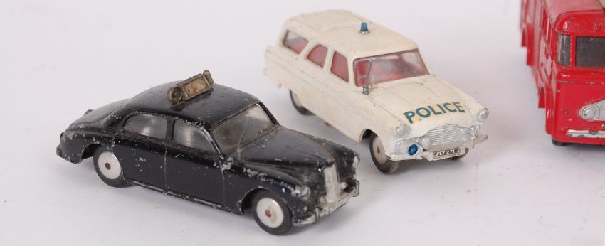 CORGI & DINKY; A collection of 5x vintage loose Corgi & Dinky diecast model cars, comprising of: Ford Zephyr Motorway Patrol Car, Ford Zephyr Estate, Dinky 259 Fire Engine, Dinky Austin Taxi and Riley Pathfinder.