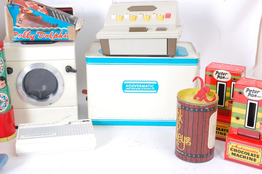 TINPLATE; A collection of assorted vintage children's tinplate (mostly) and other related toys. To include Casdon Scales (boxed), Casdon Till (boxed), Hoover twin tub washing machine, Pickup Monkeys, etc.