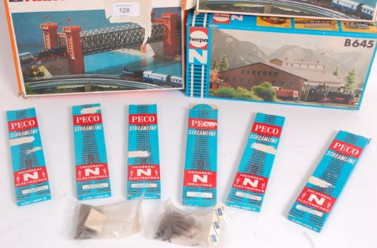 RAILWAYS: A collection of N Gauge railway trainset accessories to include 2x Arnold scenery models in boxes, a Herpa building (also boxed) and 6x sets of boxed Peco points.