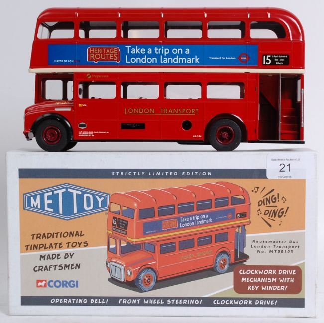 CORGI METTOY; An original Corgi Mettoy tinplate clockwork model bus - a red London Routemaster MT00103. Presented in original box, with paperwork and original key. Remarkable condition 'as new' - appears unused (box has split ends)