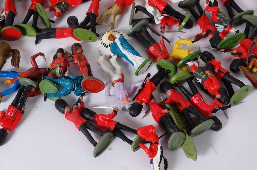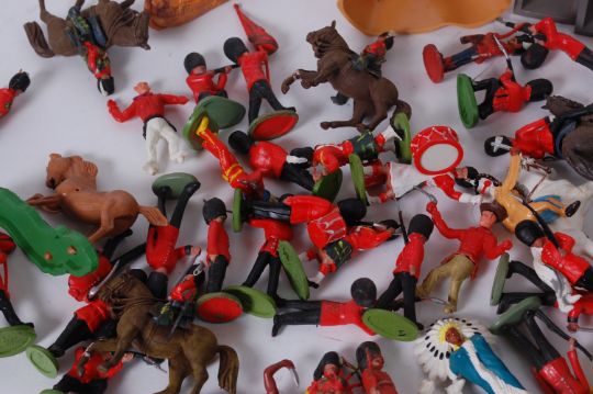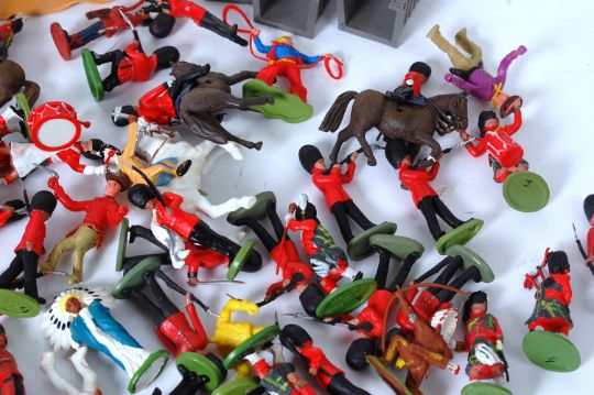 BRITAINS; A mixed assortment of vintage Britains and other plastic soldiers - comprising of Grenadier Guards, Highlanders, and Cowboys & Indians, along with some accessories to the figures - boat, sentry boxes etc..
