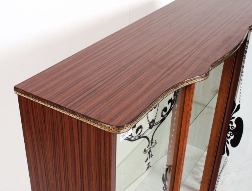 A vintage mid 20th century retro display cabinet having tapered supports with sliding glass doors and flared top above. Measures: 96cms x 100cms x 31cms.