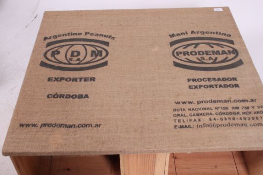 An unusual scratch built Industrial style coffee table constructed from wine boxes having hessian sack top cover all raised on castors. Measures: 51cms x 82cms x 75cms.