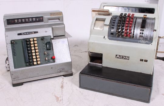 2 vintage mid 20th century Industrial Betting Shop tills, one by ADS And the other by Sweda. Measures: 43cms x 37cms x 41cms.