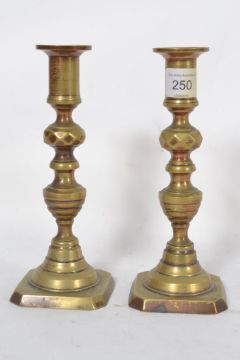 A pair of 19th century copper and brass pusher candlesticks having shaped columns with terraced bases, pushers to the underside. Measures: 20cms H.