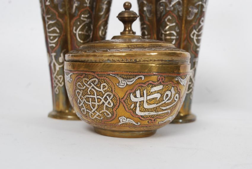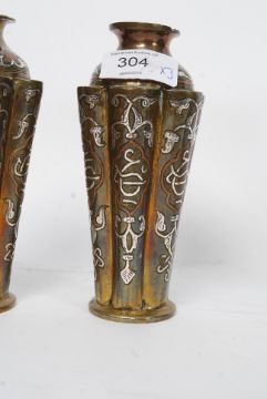 A pair of Cairo ware brass inlaid vases being inlaid with silver and copper