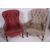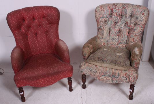A pair of Victorian style button back spoon shaped bedroom armchairs in the Victorian style raised on turned legs to each. 86 x 62 x 55